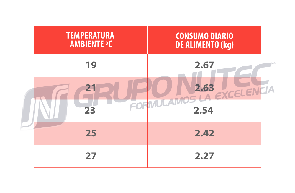 El principal factor que reduce el consumo de alimento es la temperatura ambiental. De acuerdo con el modelo de requerimientos nutricionales de cerdos del National Research Council (NRC, 2012), se observa disminución en el consumo de energía con temperaturas por arriba de la temperatura crítica superior (Cuadro 1).