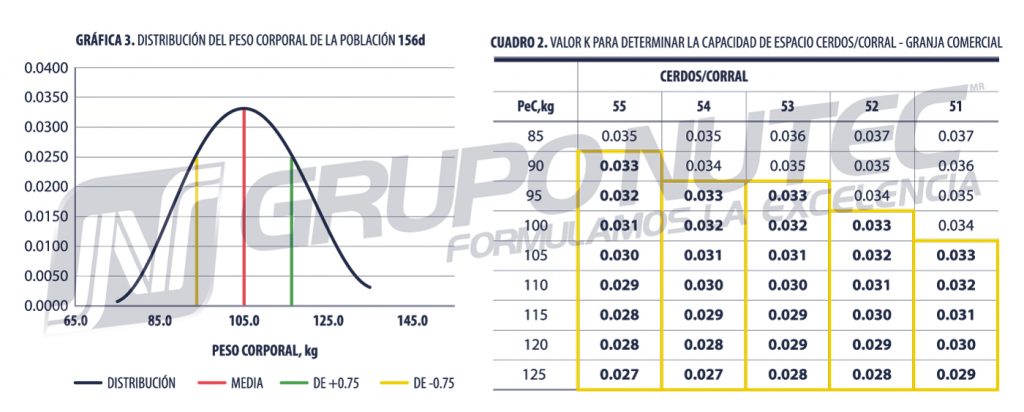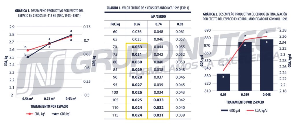 El grupo académico del NCR´89 (1993) describió los efectos productivos de la limitación del espacio en corral con cerdos de los 54 a los 113 kg, considerando un Espacio Mínimo Vital (EMV) de 0.56, 0.74 y 0.93 m2/cerdo, encontrando efectos lineales (P < 0.01) (Gráfica 1) en relación con el aumento del espacio por cerdo para Ganancia diaria de peso (GDP) y Consumo diario de alimento (CDA). Para asociar estos resultados el Cuadro 1 presenta los valores calculados para el valor crítico de k en cada tratamiento por rangos de peso, en él se puede observar que los tratamientos con 0.56 y 0.74 m2/cerdo presentaban una limitante negativa (marcado en amarillo) por espacio a partir de los 70 y 105 kg de peso respectivamente.