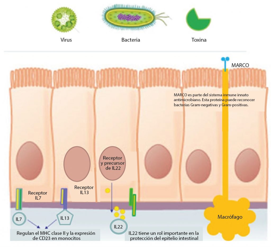 Estudios de transcripción, realizados en colaboración con la Unidad de Secuenciación Masiva y Bioinformática de la UNAM, en intestino de pollos de engorda demuestran su efecto inmunomodulador al haber evaluado los perfiles de expresión de genes relacionados con la respuesta inmune intestinal en aves alimentadas con dietas suplementadas con PROFLORA®. En el estudio mencionado se observó la sobreexpresión de diversos genes que median la respuesta inmune. Dentro de estos encontramos genes que codifican para citosinas como Interleucina 13 (IL13), Interleucina 22 (IL22), el receptor de la Interleucina 7 (IL7) y el complejo receptor de macrófagos, tipo recolector (MARCO), representados en la Figura 1. IL13 estimula el crecimiento y diferenciación de células B, inhibiendo células proinflamatorias como el factor de necrosis tumoral (TNF). Mientras que IL22 es producida por la activación de células T y Natural Killer (NK), e inician la respuesta inmune innata sobre patógenos en epitelio celular respiratorio e intestinal. Esta es un miembro del grupo de citocinas llamados Superfamilia IL10, los cuales son potentes mediadores de la respuesta celular inflamatoria al inhibir la síntesis de citocinas proinflamatorias. Finalmente, IL7 es producida en el epitelio intestinal y células Goblet y tiene como función la regulación de linfocitos e inmunoglobulinas.