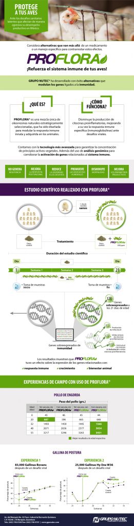 Por último, la suplementación de PROFLORA® a pollos de engorda y gallinas de postura es una solución a la disminución a la productividad y mortalidad de los animales con desafíos virales y/o bacterianos. Siendo que la modulación del sistema inmune prepara al organismo ante posibles ataques de patógenos o agentes extraños que pretendan colonizar al individuo, evitando una inflamación descontrolada. Generando de la misma manera, un menor desgaste en el ave al dirigir la respuesta inmune específica, desarrollando células inmunitarias como linfocitos, inmunoglobulinas que atacarán al patógeno.