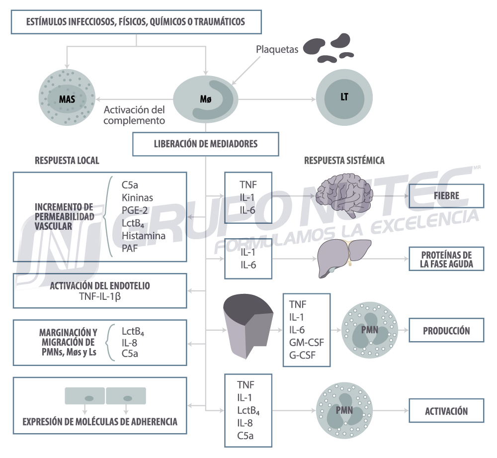 La respuesta inflamatoria aguda se inicia en el endotelio segundos después de que ocurra una agresión, y se manifiesta por vasodilatación e incremento de la permeabilidad capilar con hiperemia, aumento de la temperatura local, enrojecimiento, edema, dolor, calor y rubor. En minutos son llamados los polimorfonucleares (PMNs) que se encargan de destruir al patógeno. A los cambios locales les sigue un componente sistémico que se caracteriza por fiebre, leucocitosis y producción, por el hígado, de un grupo de proteínas conocidas como de la fase aguda (Evans et al, 2015). Simultáneamente, hay aumento en la producción de varias hormonas que conducen a hiperglicemia e incremento del catabolismo proteico.
