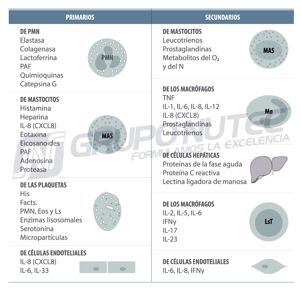 Los mediadores de la inflamación son muchos y cumplen diferentes funciones; son producidos por las distintas células del sistema inmune, así como por la activación de los sistemas del complemento, la coagulación y las kininas. Los mediadores primarios se encuentran presintetizados en las células y son rápidamente secretados y activados cuando se inicia un proceso inflamatorio. Los secundarios requieren un proceso de transcripción y traducción que tarda varias horas en desarrollarse (Figura 3).