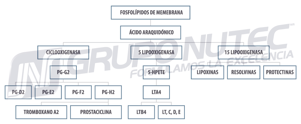 Son moléculas que se generan a partir de los lípidos de membrana de células del sistema inmune por acción de otras moléculas como citoquinas, trombina, bradiquinina, C5a y PAF, que activan la fosfolipasa, enzima que actúa sobre los lípidos de membrana para generar el ácido araquidónico (Figura 4). A partir de este ácido, diferentes enzimas producen distintos eicosanoides: la ciclooxigenasa genera las prostaglandinas (PGs); la 5-lipooxigenasa los leucotrienos (LTs) y la 15-lipooxigeasa las lipoxinas (LPXs). Los derivados del omega-3, por acción de lipooxigenasas 5 y 15, generan moléculas antiinflamatorias como resolvinas, meresinas y protectinas (Gomez et al, 2017).