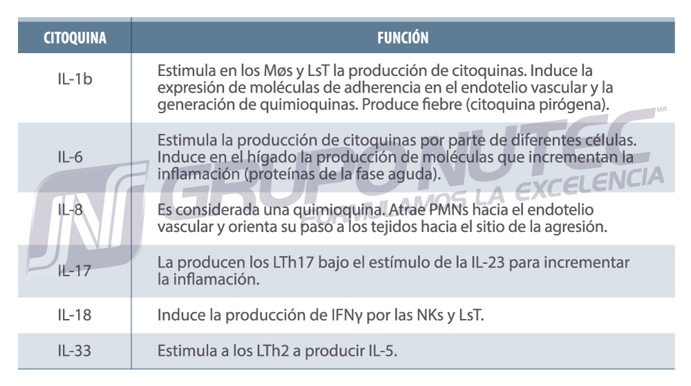 Producción de citoquinas. El reconocimiento de los PAMPs, la liberación de eicosanoides y de factores del complemento inducen la producción de citoquinas proinflamatorias como TNF, IL-1β, IL-6, IL-8, IL-17, IL-18 e IL-33, que actúan sobre diferentes células para estimularlas a producir otras citoquinas y quimioquinas encargadas de atraer y activar PMNs y Mons e inducir la generación de diferentes subpoblaciones de LsT responsables de la inmunidad innata y adquirida. Las principales funciones de las citoquinas mencionadas se presentan en la Tabla 1. Las IL-1β e IL-18 se encuentran en forma inactiva en el citoplasma de Møs y de las DCs y su liberación se logra por activación de los inflamasomas (Lamkanfi y Dixit, 2014).