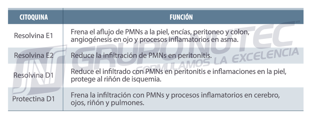 Otros eicosanoides. De otro lípido de membrana, el ácido eicosapentaenoico (EPA), se derivan diferentes moléculas antinflamatorias como las lipoxinas (LPXs), que frenan la producción de leucotrienos (Tabla 2). Su carencia o producción defectuosa es uno de los factores responsables del desarrollo de la fibrosis quística, afección pulmonar que se acompaña de un proceso inflamatorio crónico en el cual hay una colonización a nivel bronquial por Pseudomona aeruginosa. La lipoxina A4, producida por las plaquetas, frena la llegada de PMNs y activa a los Møs a fagocitar los restos celulares y reparar los daños causados por la inflamación.