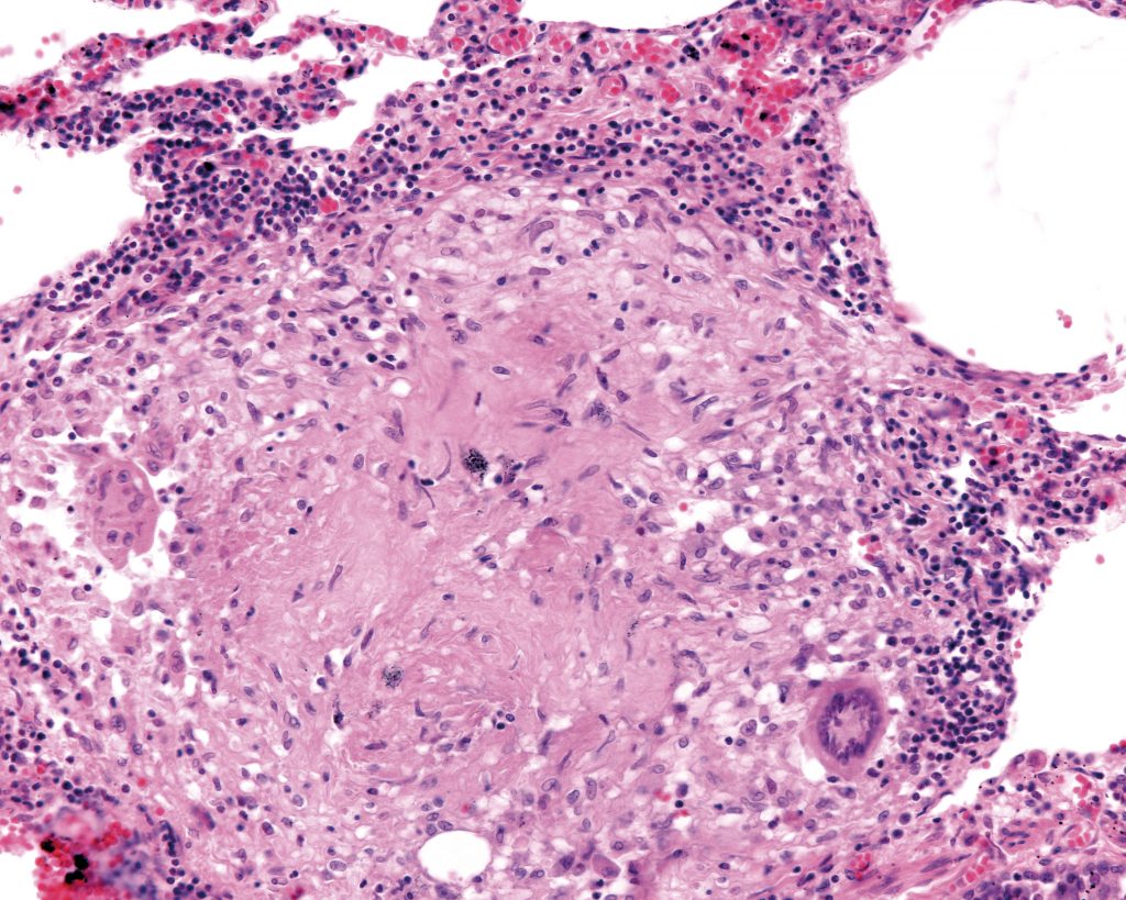 Entre los OLTs sobresalen los granulomas, estructuras similares a un ganglio linfático, con acúmulo de macrófagos y células gigantes multinucleadas de 40 a 60 micras de diámetro, con 15 o más núcleos. No se sabe si estas se forman por división incompleta de un macrófago o por fusión de varios de ellos. Estas células gigantes están rodeadas de linfocitos, especialmente CD4 y CD8. En el interior del granuloma hay formación de nuevos capilares con epitelio cuboide, que permite el ingreso de las diferentes células que conforman el granuloma (Figura 4).