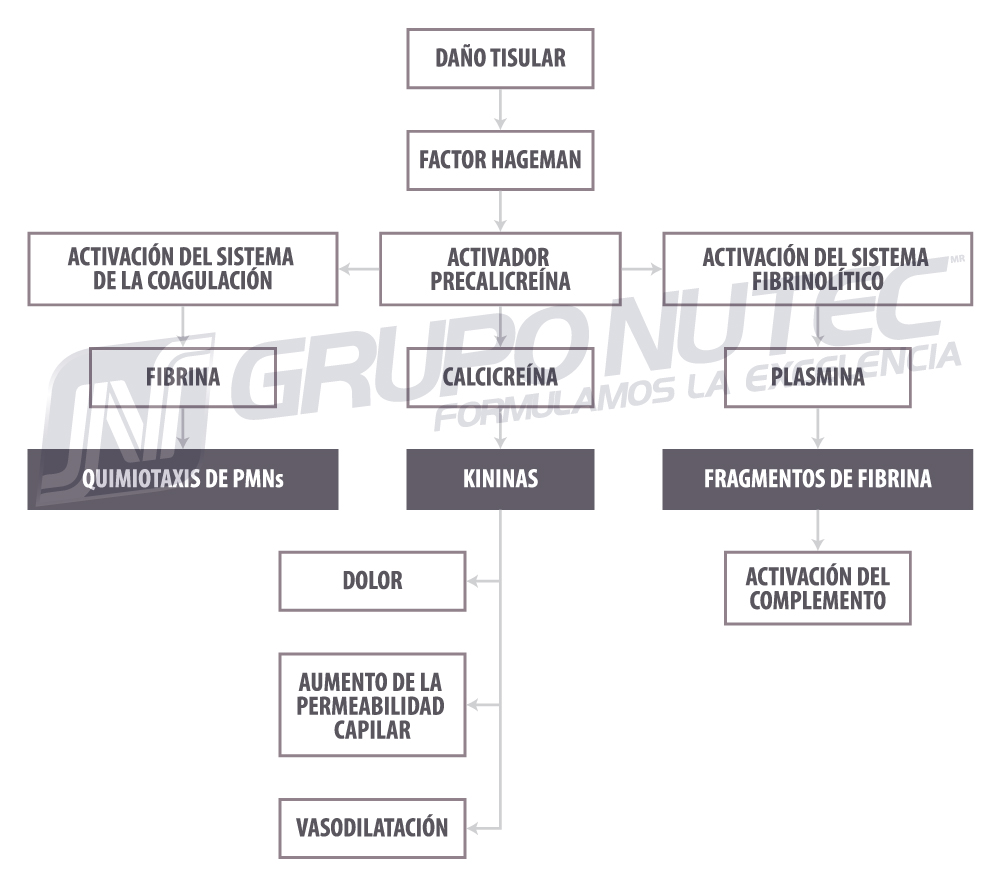 En condiciones normales, en el plasma se encuentran kininógenos, moléculas que en casos de inflamación son activadas por la kalicreína, que a su vez es activada por productos derivados de daño tisular, como colágeno, cartílago, componentes de las membranas basales, endotoxinas y factor Hageman o XII del sistema de la coagulación. Esta activación da origen a bradikinina y kalicreína, sustancias de gran actividad biológica que aumentan la permeabilidad vascular, inducen vasodilatación, producen dolor y en algunas circunstancias activan el sistema del complemento. (Figura 1) (Cano et al, 2017).