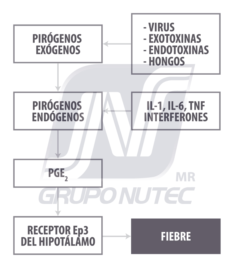 La fiebre es una de las manifestaciones que indican la presencia de infección o inflamación. El mecanismo que la produce se ha perfeccionado a lo largo de cientos de millones de años de evolución, haciéndola importante como mecanismo de defensa. Diferentes componentes microbianos, conocidos como pirógenos externos, inducen la generación de los pirógenos endógenos que son la IL-1, la IL-6 y TNF-a producidos por macrófagos, y células endoteliales (Evans et al, 2015).