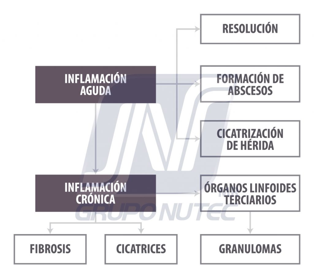 Figura 5. Resolución de los procesos inflamatorios agudos y crónicos. Imagen cortesía del libro Inmunología de Rojas, 2017.