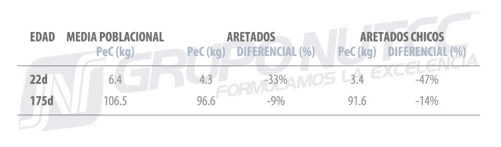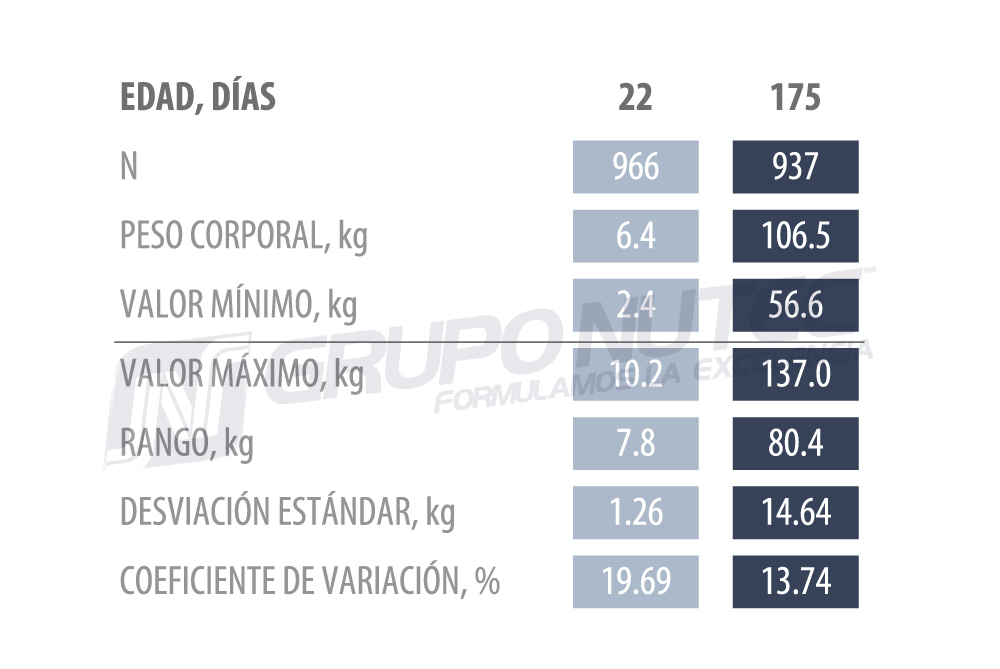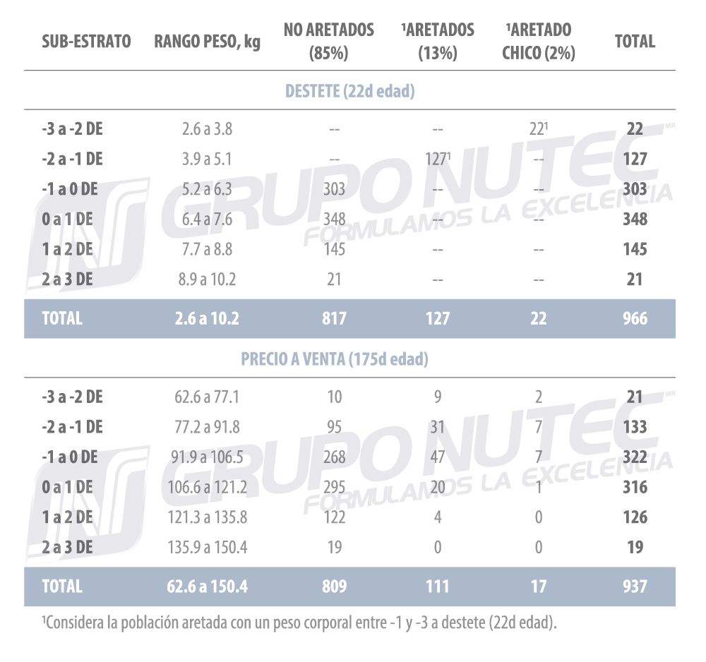Para determinar el desempeño productivo del grupo se pesó individualmente a la población (N = 966) a destete (22d) y se aretó el 15% de los cerdos más ligeros del grupo, por lo que, del total de la población se generaron tres sub-estratos diferenciados por el rango de peso; a) No aretados (+ 3 a -1 DE); b) Aretados (-1 a -2 DE) y c) Aretado chico (-2 a -3 DE). El grupo se pesó nuevamente previo al inicio de venta (175d). El análisis de la información corresponde al uso de estadística descriptiva del peso corporal y su distribución por sub-estrato a través del tiempo.