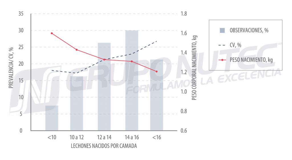 El desarrollo genético de hembras hiperprolíficas ha permitido producir un mayor número de lechones/hembra/año. Para describir el efecto productivo de estas mejoras, se presentan en la Gráfica 1 los resultados del trabajo de Garrido (2016), donde se aprecia que el 51% de los partos presentaron más de 14 lechones nacidos y que, a un mayor número de lechones nacidos existe una tendencia a reducir el peso promedio al nacimiento y a incrementar la dispersión de este, lo que tiene como consecuencia un mayor diferencial entre los lechones más pesados y ligeros de la camada.