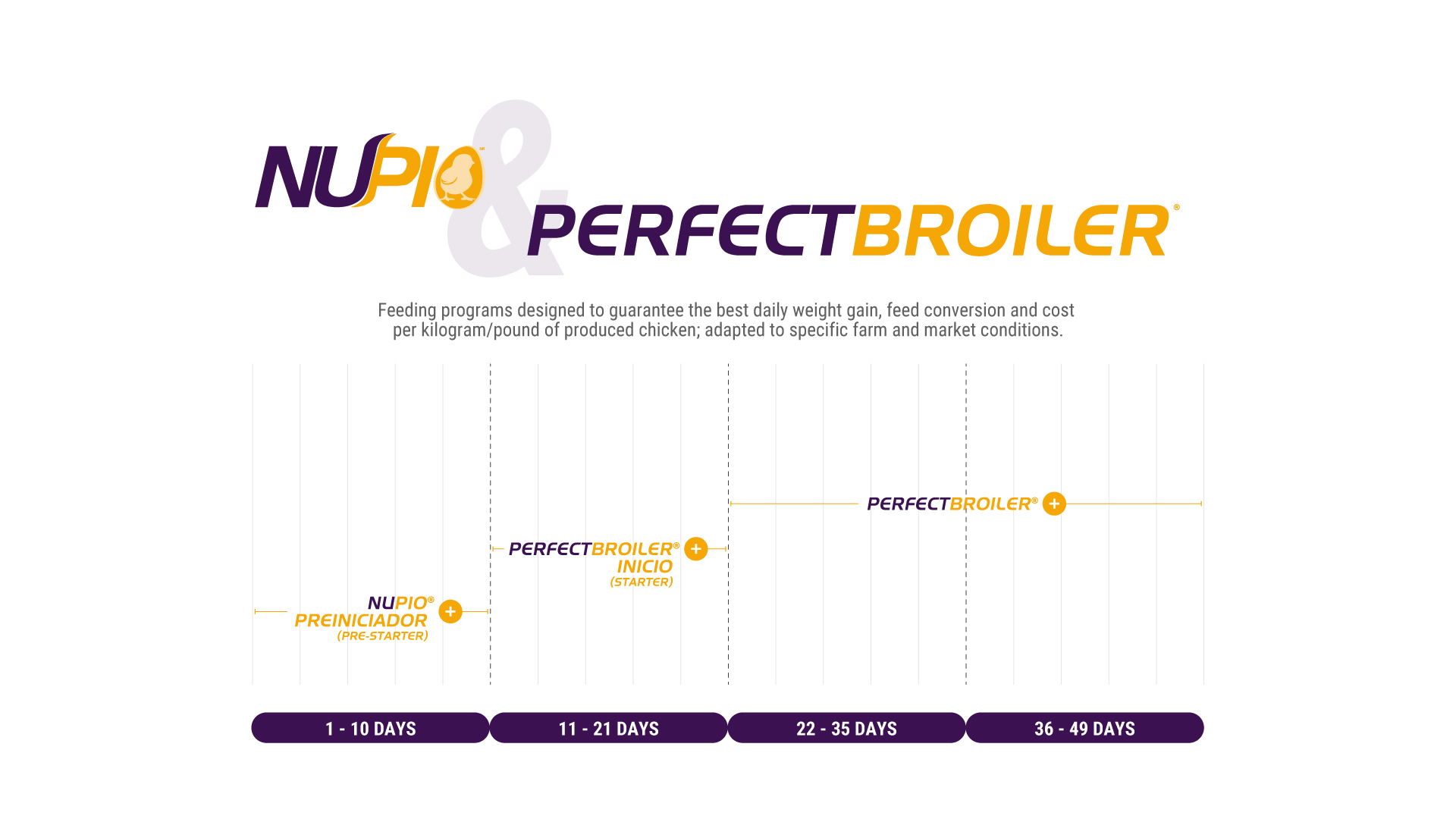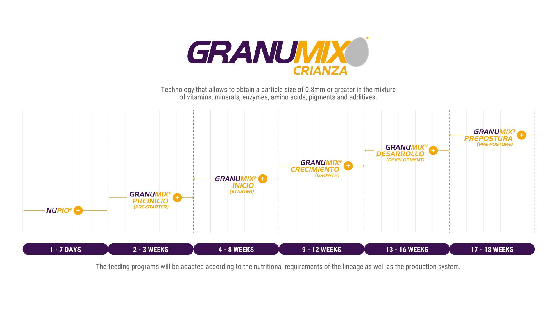 Feeding program designed to help in a better development of the digestive, immune and skeletal system; according to the market stage and need.